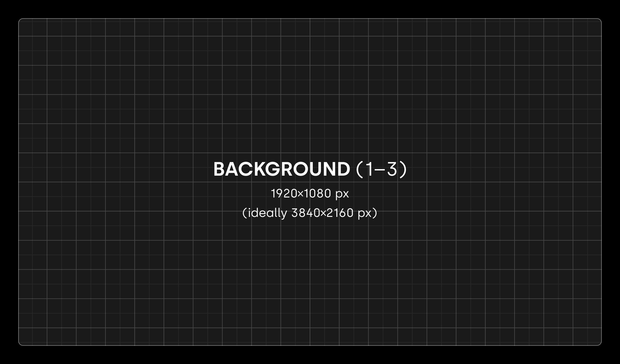 - Size: Minimum of FullHD (1920x1080px); ideally 4K (3840x2160px)