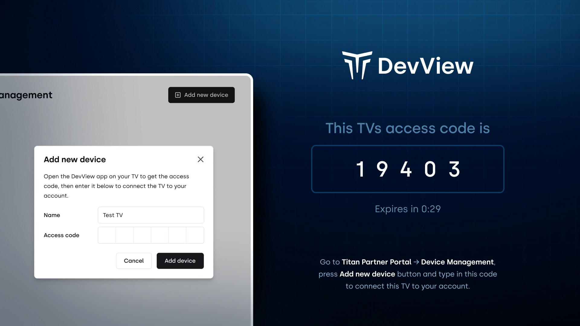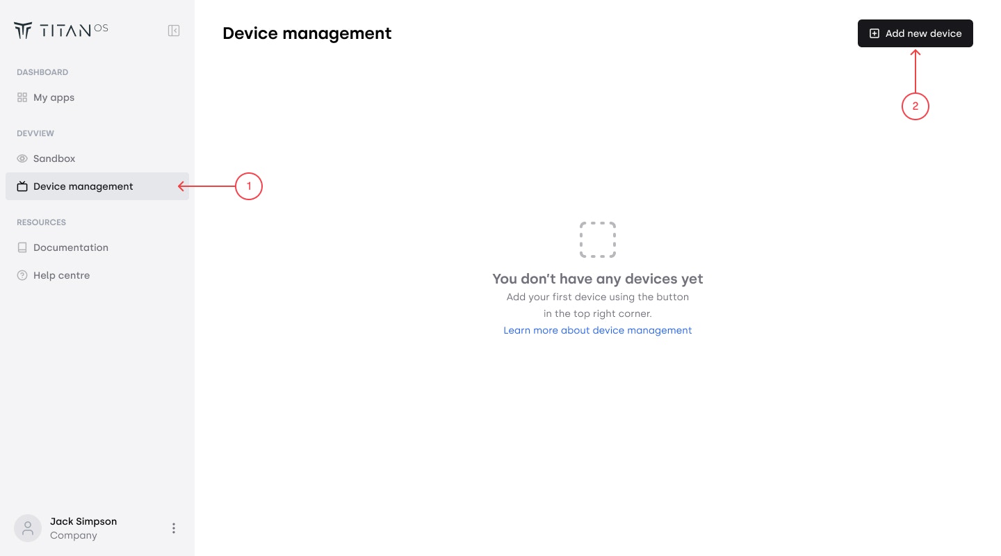 Go to Device Management to pair your TV for testing. Press “Add new device” button in the top right corner